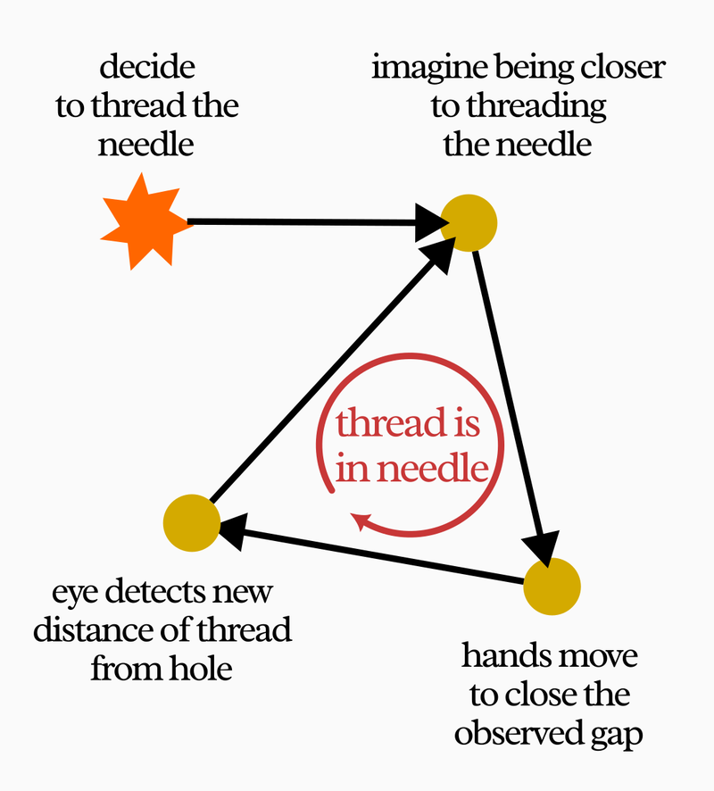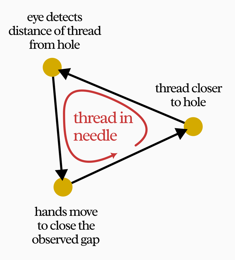 Sorry. I cheated a little when I made this diagram. It showed that a feedback loop was involved, and in this sense it did its job. But, for the sake of simplicity, I glossed over the most important aspect of human-driven control: the âwantâ part of the definition above. In order for the threading of a needle to happen, it must begin with someoneâs intention to thread the needle in the first place!