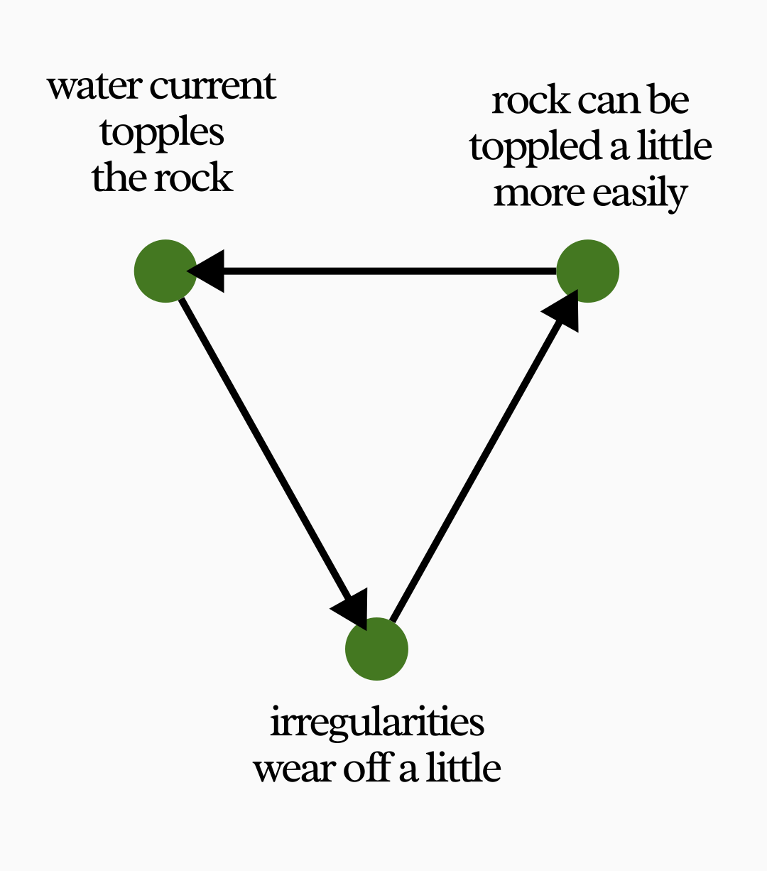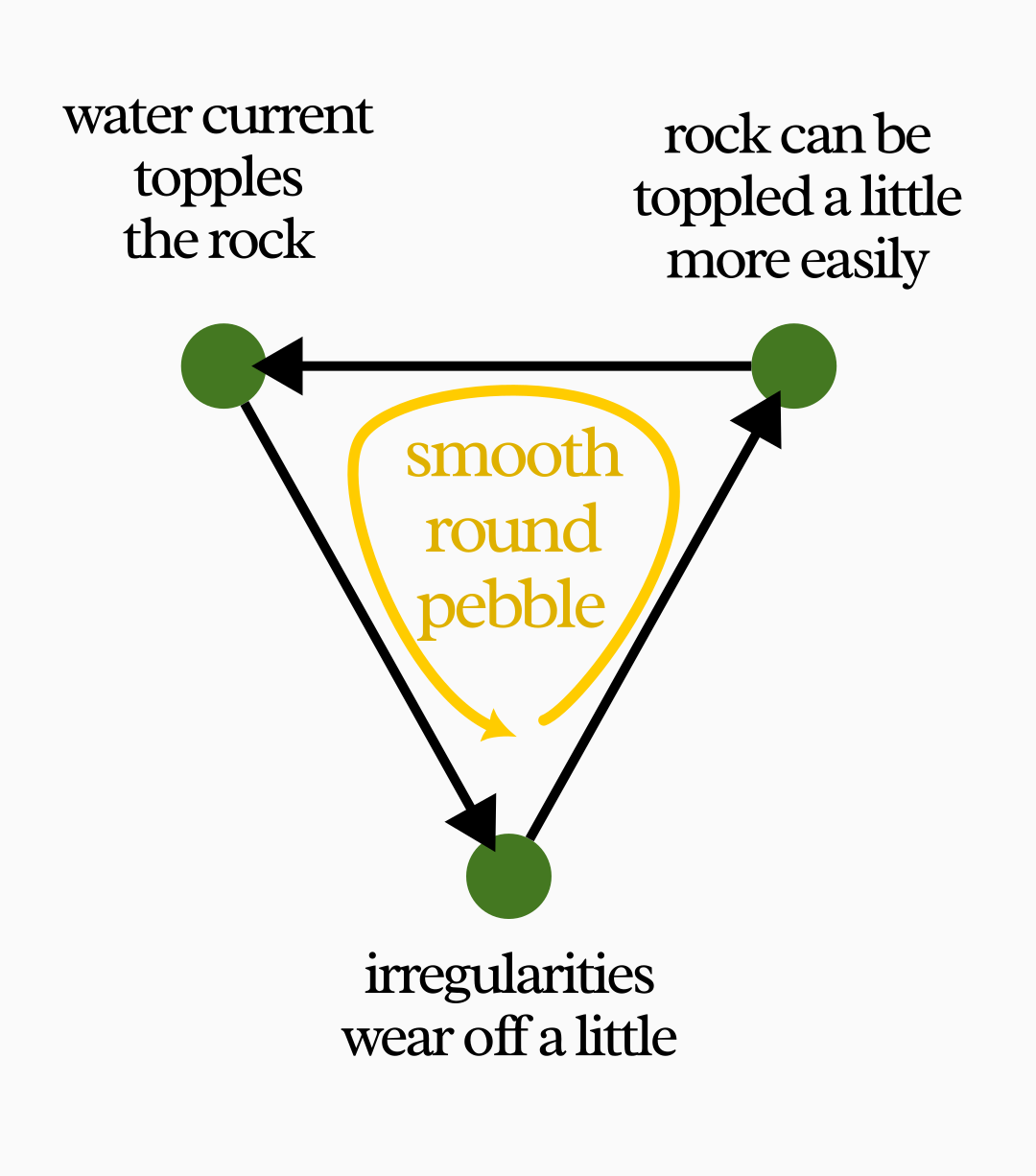 Remember the example of the rock tumbling under the waves on a beach: while tumbling, the rockâs sharp edges and protuberances rub against the surrounding rocks, wearing off a little bit at every turn; this reduction of sharp edges allows the rock to tumble more easily, wearing off its irregularities even more; and so on, until the rock is smooth and completely edge-free.