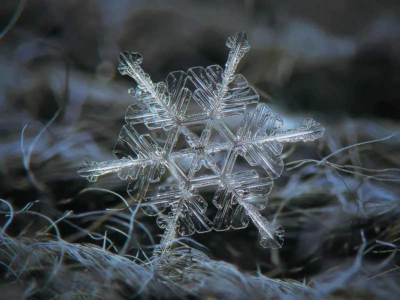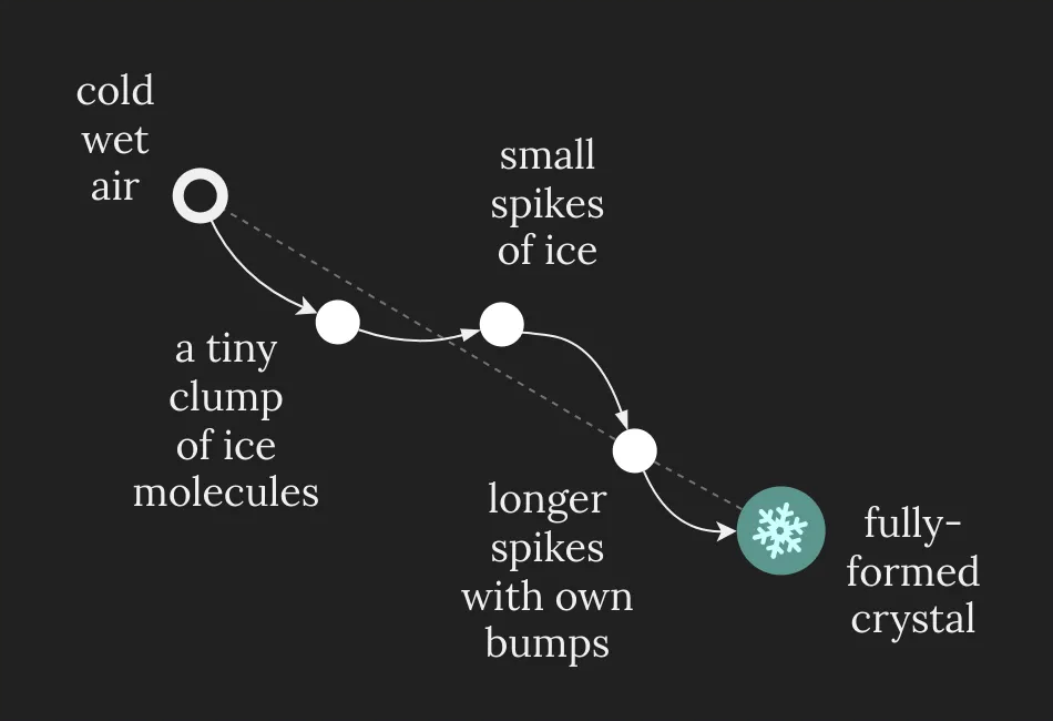 If one branch gets a tiny head start, it begins absorbing the nearby water-vapor first. The air around that branch becomes poorer in vapor, so the other branches canât grow as quickly. The already-advanced branch therefore keeps winning, becoming the longest finger on the snowflake.