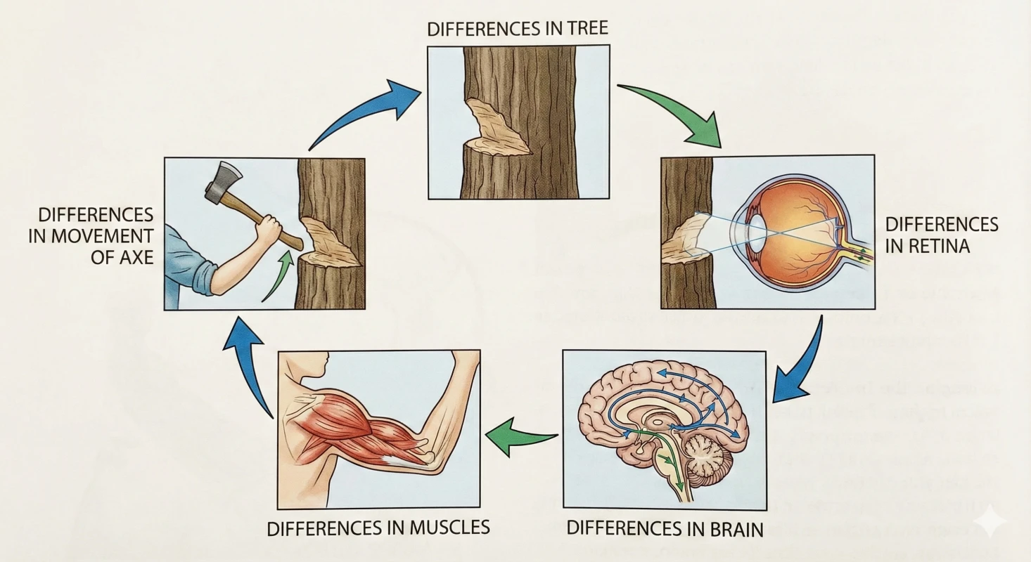 Each difference depends on the differences in the previous step: brain to muscles, muscles to axe, etc.